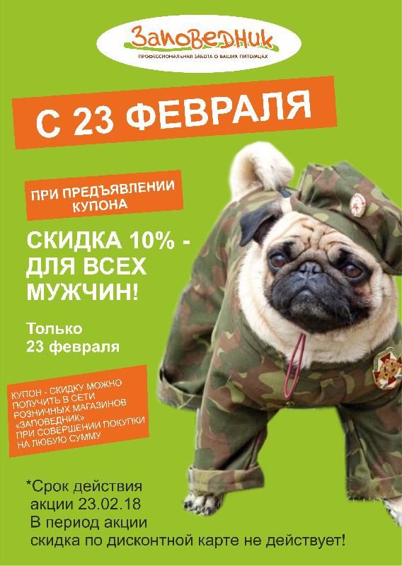 К 23 февраля готовы Скидка 10% для всех мужчин в розничных магазинах сети "Заповедник" при предъявлении купона-скидки. *Купон можно получить при совершении покупки на любую сумму.