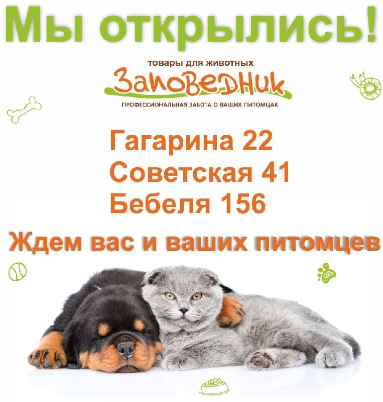 Мы стали еще шире! Открылись 3 зоомагазина "Заповедник" в сети ветеринарных аптек "Согласие" по адресам: Гагарина 22, тел. +79827002925 Советская 41, тел. +79827002757 Бебеля 156, тел. +79827002336